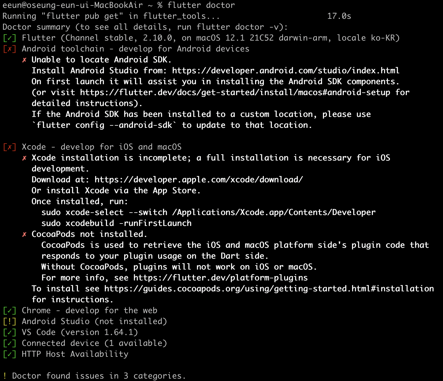 flutter doctor는 flutter를 쓸 준비가 되어 있나는 진단해 주는 명령어이다.