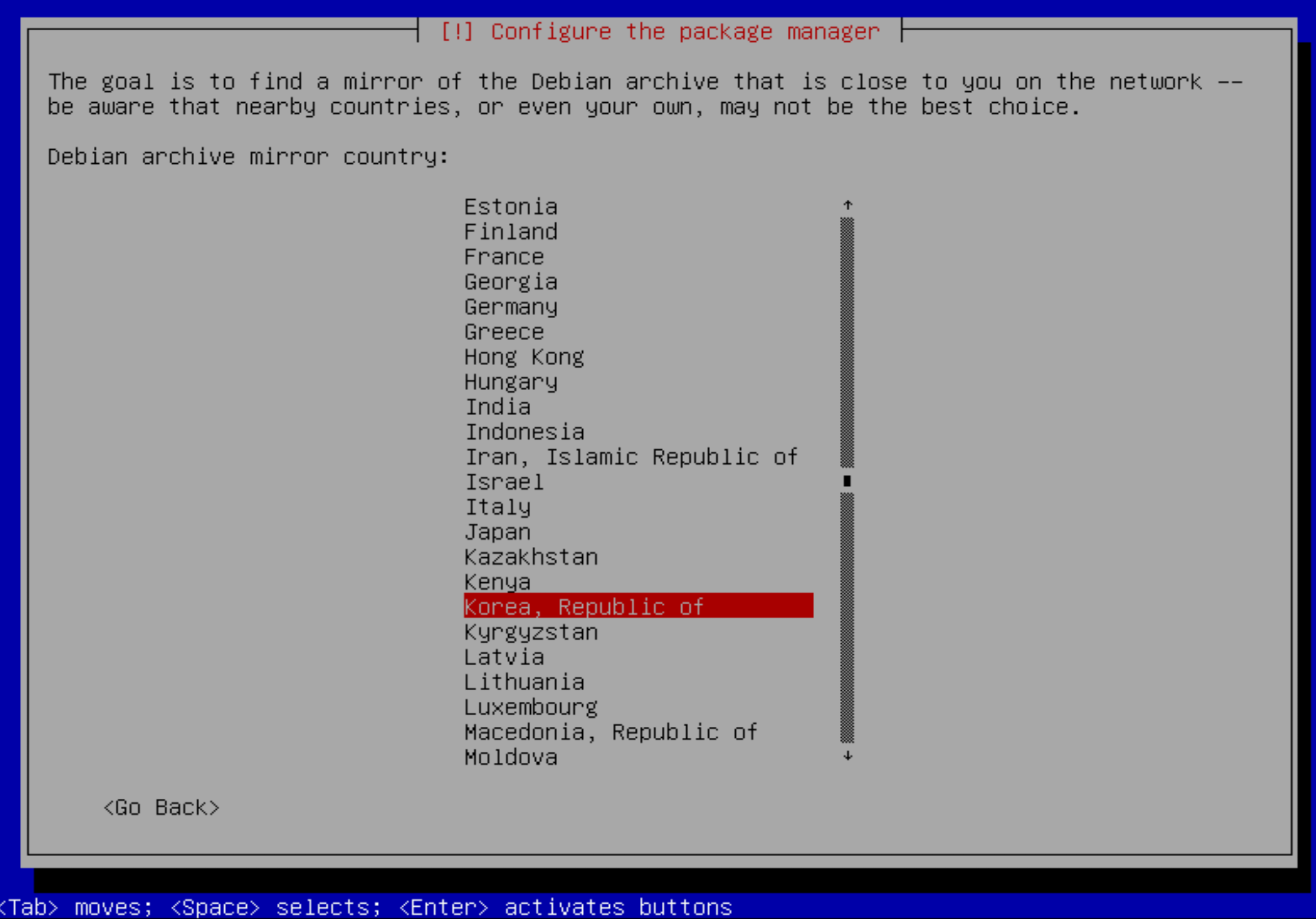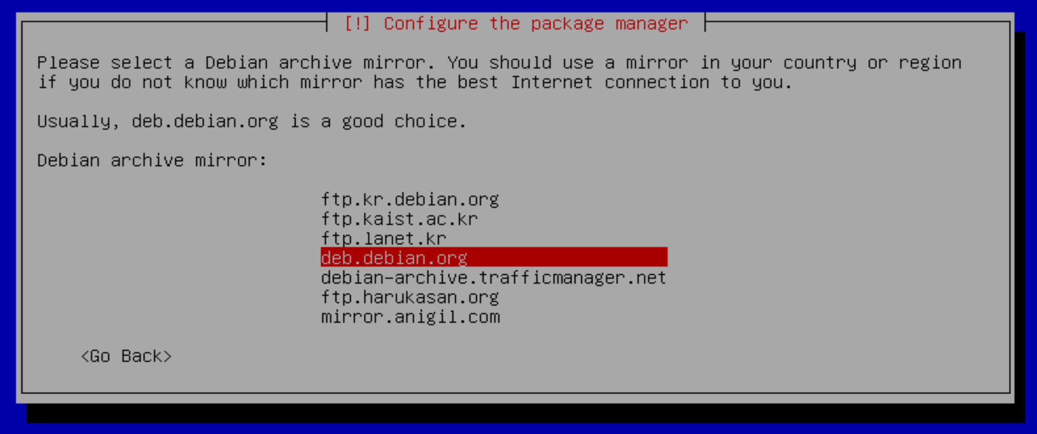 package manage를 가져올 mirror 사이트를 선택하는 페이지로 나는 default를 선택했다. (http 프록시 설정 안함)