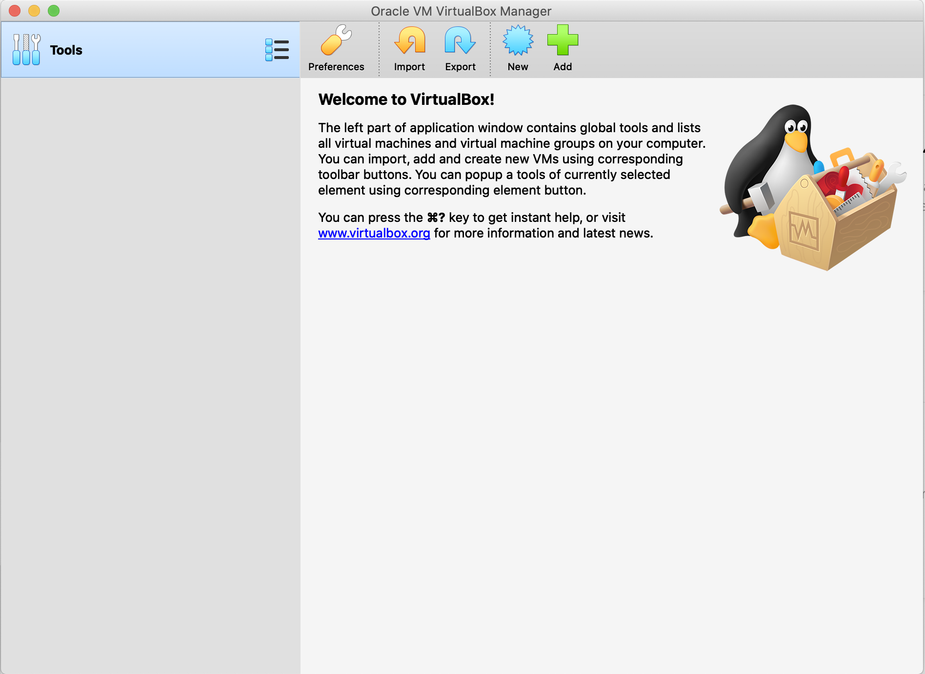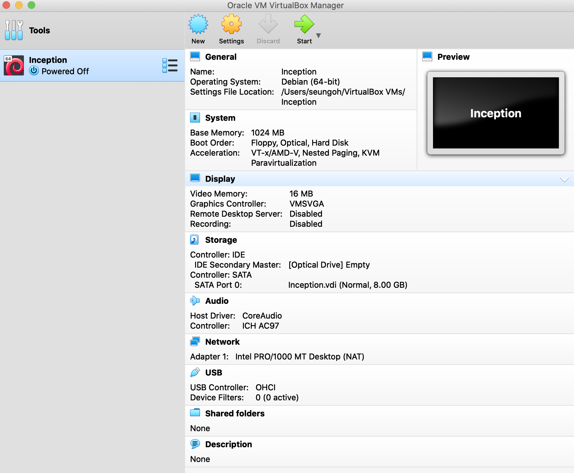 위의 과정이 끝나면 VirtualBox 메인 화면에 설치되어 있는 것을 확인할 수 있다.