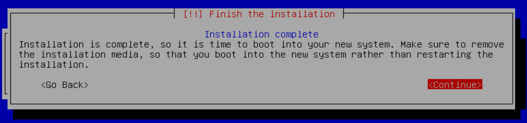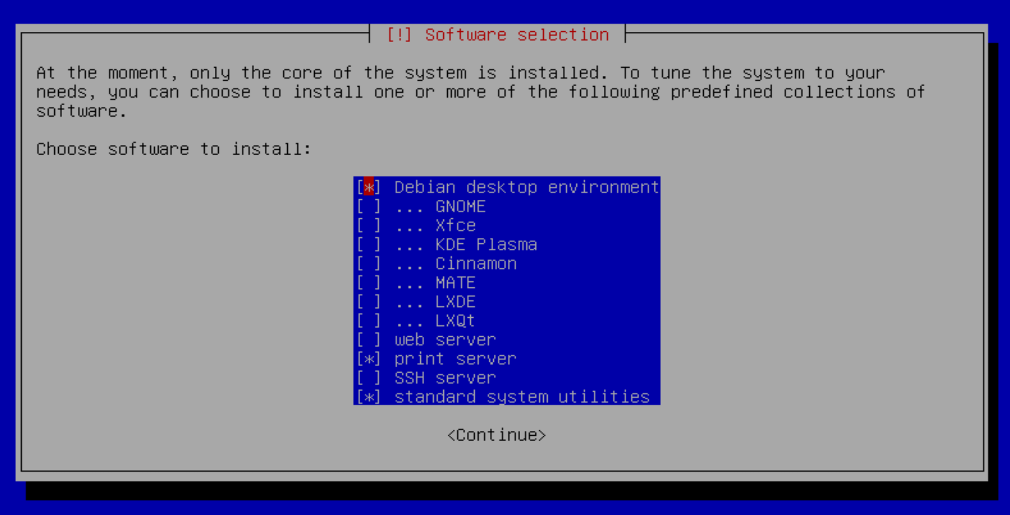 설치할 소프트웨어 선택하는 페이지이다. 나는 기본적인 것만 사용할 것이여서 default(ssh server, standard system utilities)로 선택하고 continue!