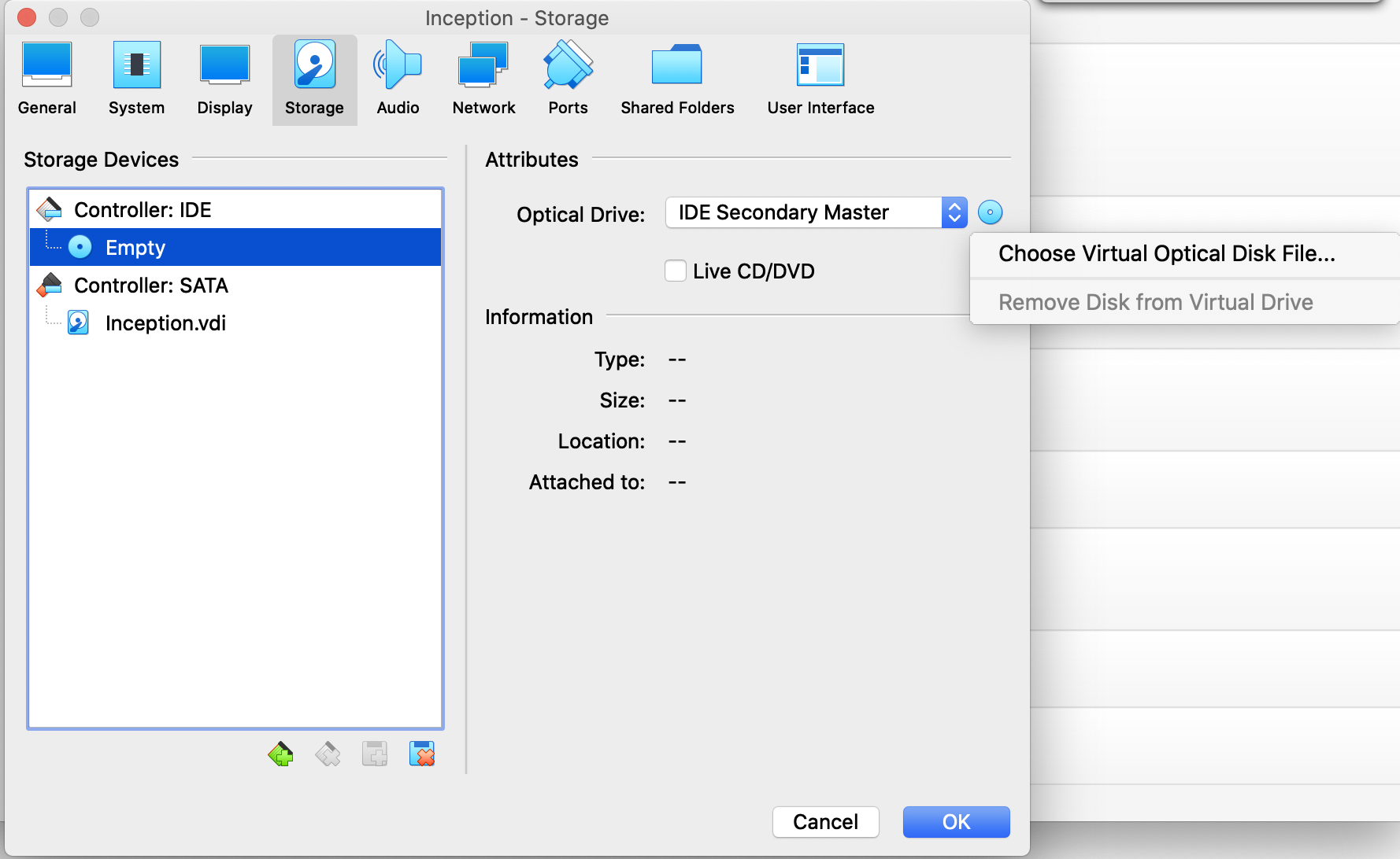 Settiings - Storage에 들어가서 밑의 그림과 같이 Controller:IDE - Empty를 클릭 후 옆이 디스크 버튼을 눌러 "choose virtual optical disk file..."를 클릭한다.