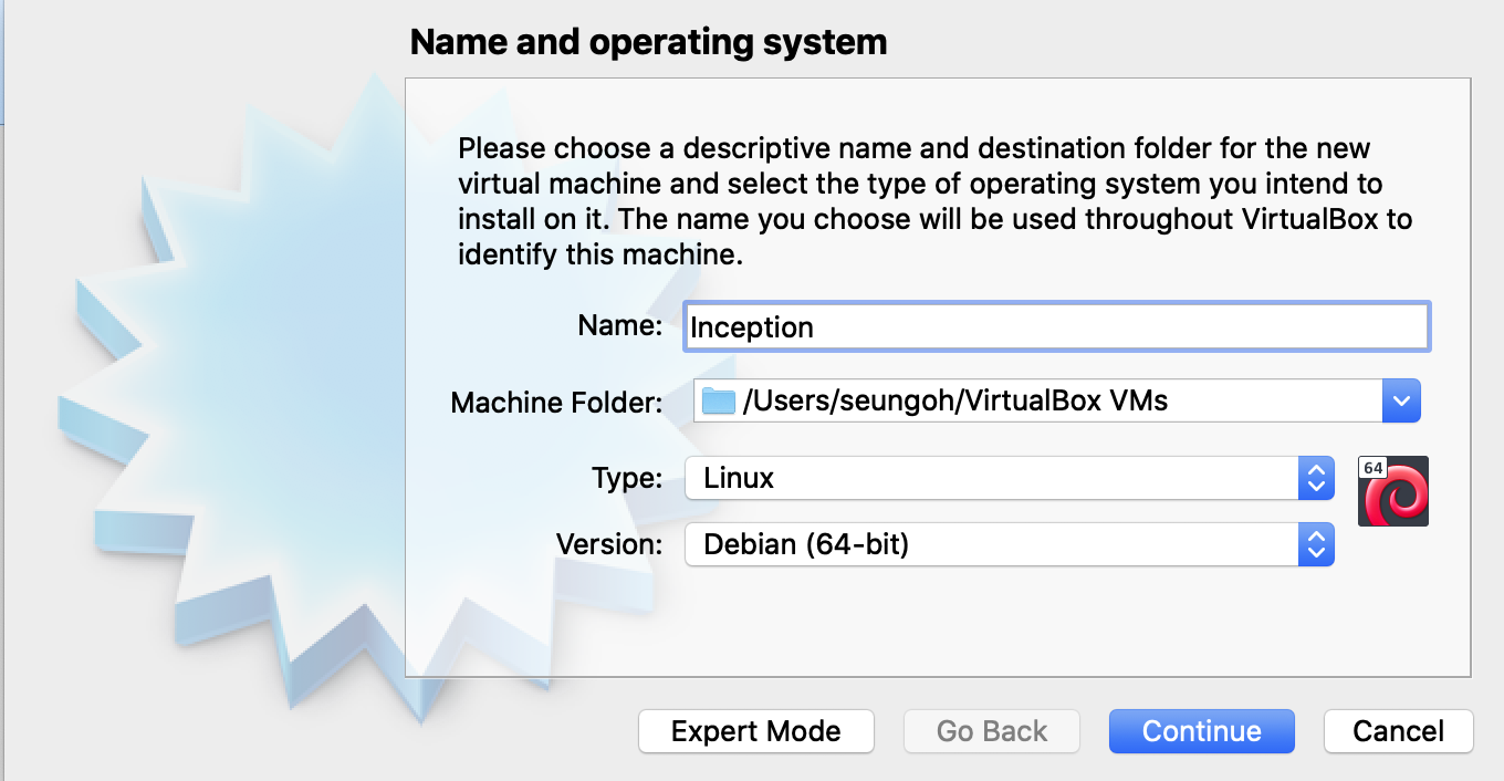 나는 debian buster을 깔기 때문에 type = 리눅스, version = debian(6bits)로 설정해줬다.