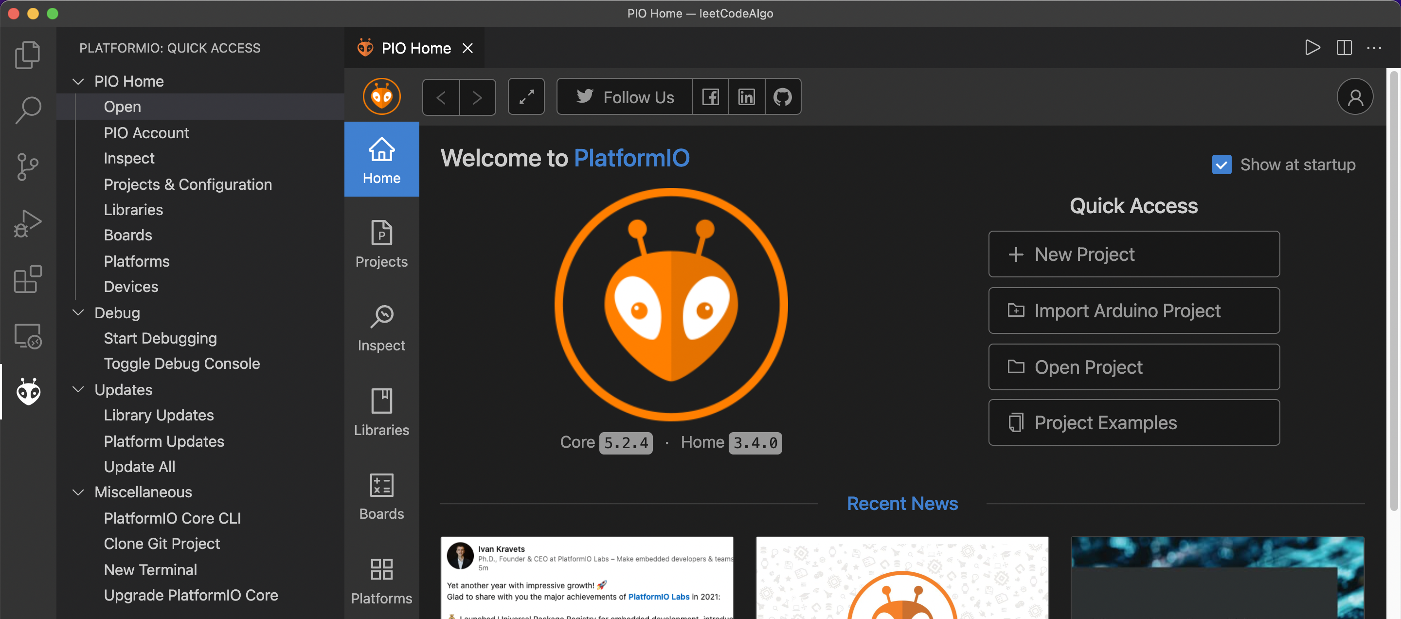 들어가서 PIO Home - Open을 누르면 PIO(PlatformIO)의 홈 화면을 들어가진다