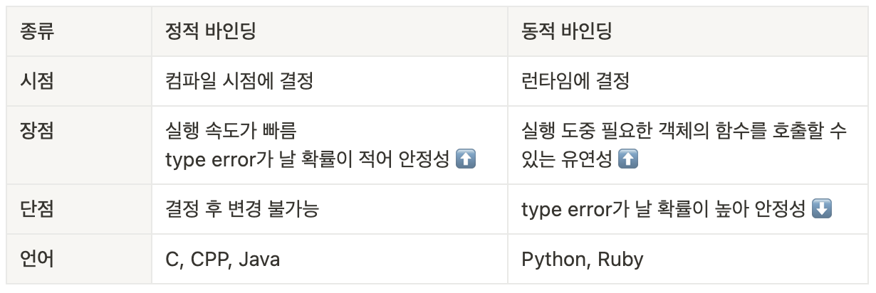 컴파일 시점에 결정되는 바인딩을 정적 바인딩이라고 함!