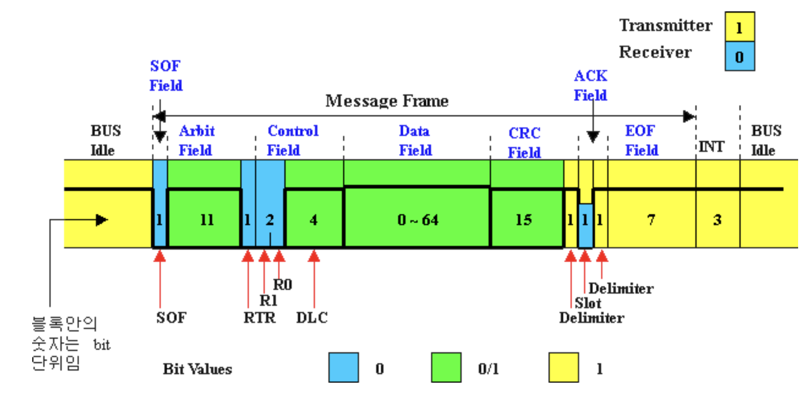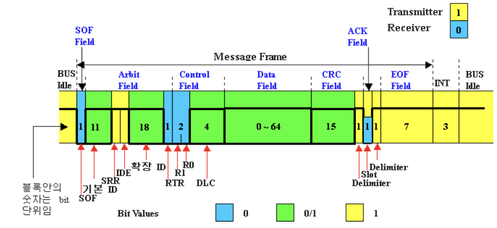 - 표준 CAN(2.0A)과 차이점은 중재 필드가 두 개의 CAN 메시지 식별자로 구분되어 포함된다.