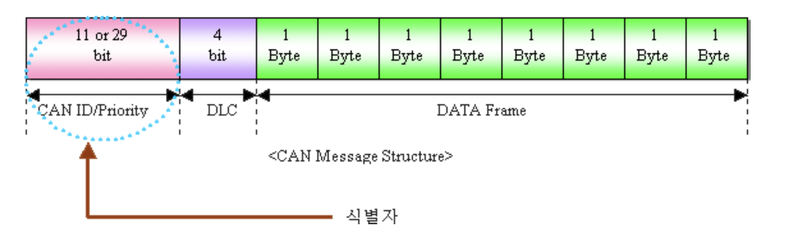 대신에 각 노드의 데이터 메시지 항목에 CAN 네트워크 상에서 노드를 식별하기 위한 식별자(ID, 2.0A : 11bits, 2.0B : 29bits)를 가진다.